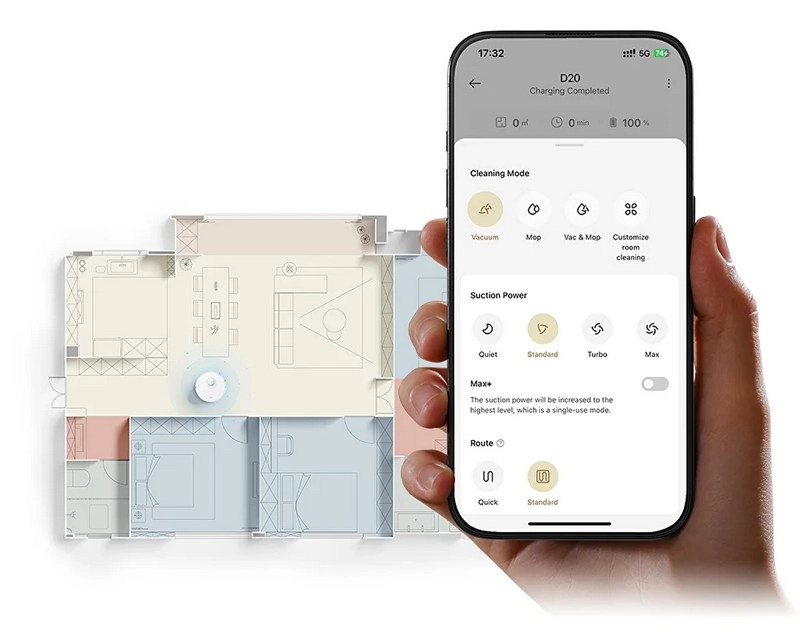 Через приложение Dreamehome можно задать параметры уборки для каждой комнаты — от уровня мощности до режима влажности и количества проходов. Также легко настраивается график и выбор конкретных зон для наведения чистоты.