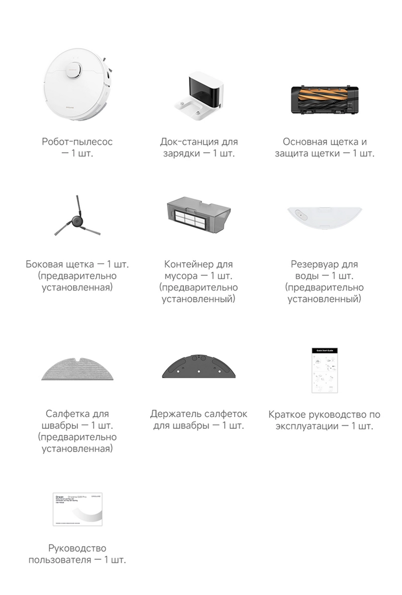 | Комплектация | робот-пылесос - 1 шт., док-станция для зарядки - 1 шт., основная щетка и защита щетки - 1 шт., боковая щетка - 1 шт. (предварительно установленная), контейнер для мусора - 1 шт. (предварительно установленный), резервуар для воды - 1 шт. (предварительно установленный), салфетка для швабры - 1 шт. (предварительно установленная), держатель салфеток для швабры — 1 шт., руководство пользователя - 1 шт., краткое руководство по эксплуатации - 1 шт. | |