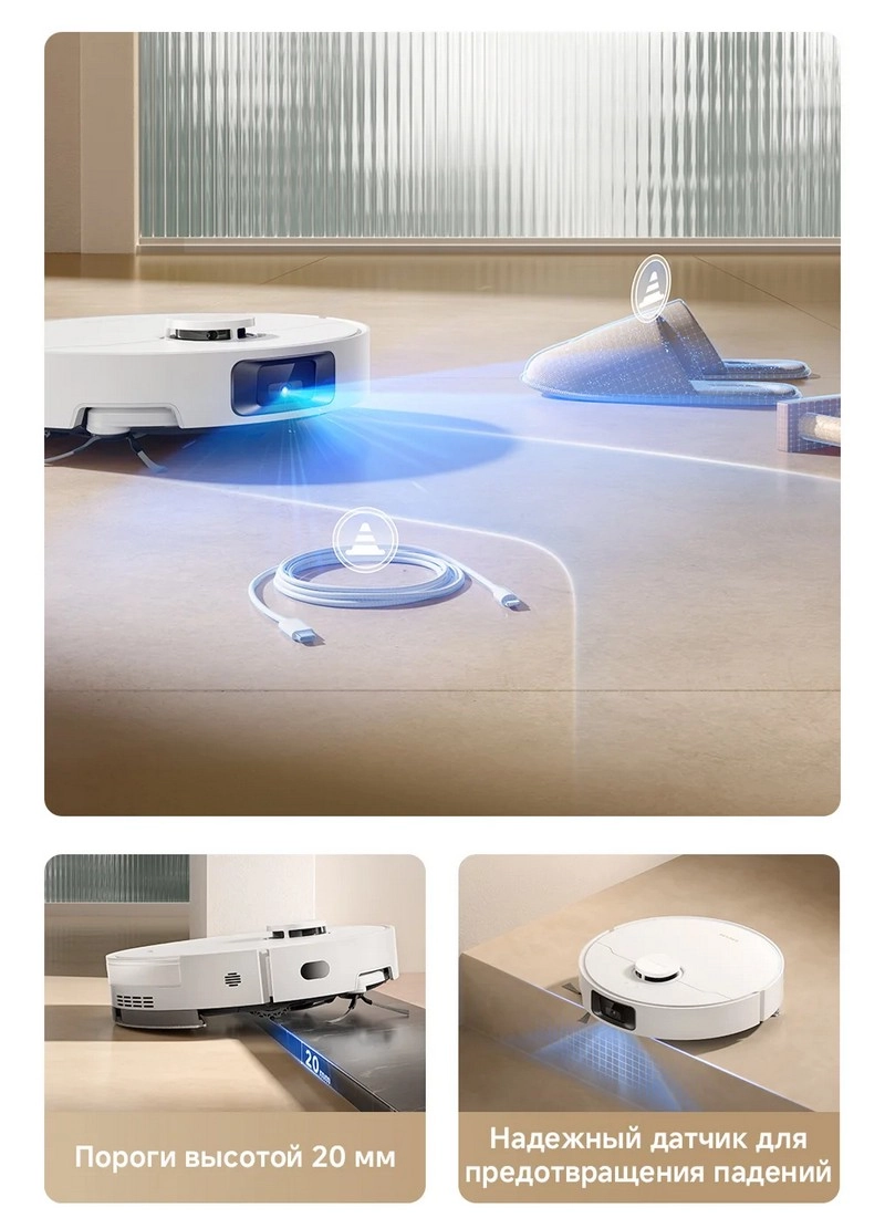 Dreame D20 Pro способен точно обходить мебель и препятствия, а также защищён от падения с высоты. Возможность установки виртуальных границ позволяет исключить нежелательные зоны из маршрута и сделать уборку более гибкой и безопасной.