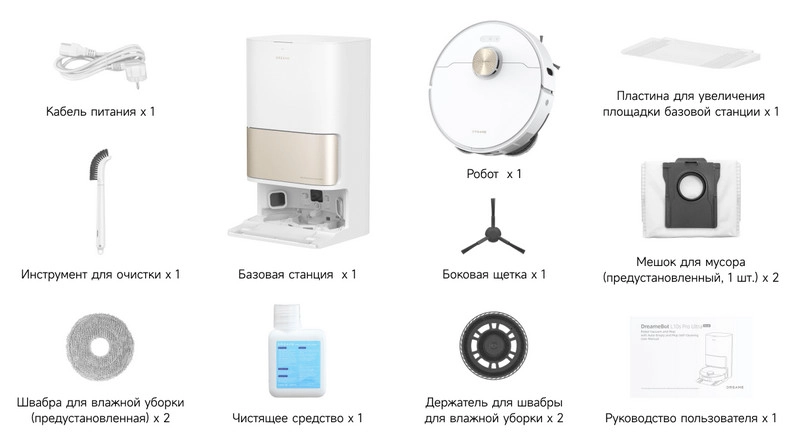 Комплектация Робот-пылесос, базовая станция, кабель питания, пластина для увеличения площадки базовой станции, держатель швабры для влажной уборки х 2, швабра для влажной уборки х 2, чистящее средство, инструмент для очистки, мешок для мусора х 2, руководство пользователя