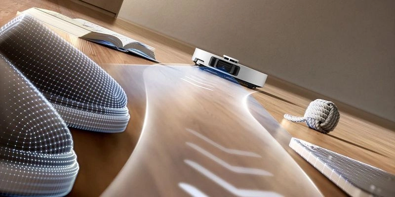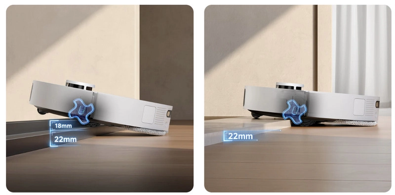 В Dreame L40S Ultra реализован трёхэтапный алгоритм: сначала лазерные датчики точно определяют высоту и форму порога, затем вспомогательные мини-колёса фиксируют устойчивость даже на скользких или влажных участках, а после этого основные колёса аккуратно перемещают робот через препятствие высотой до 40 мм. Такой механизм позволяет устройству свободно перемещаться между комнатами и зонами с разным уровнем пола, не снижая качества уборки.