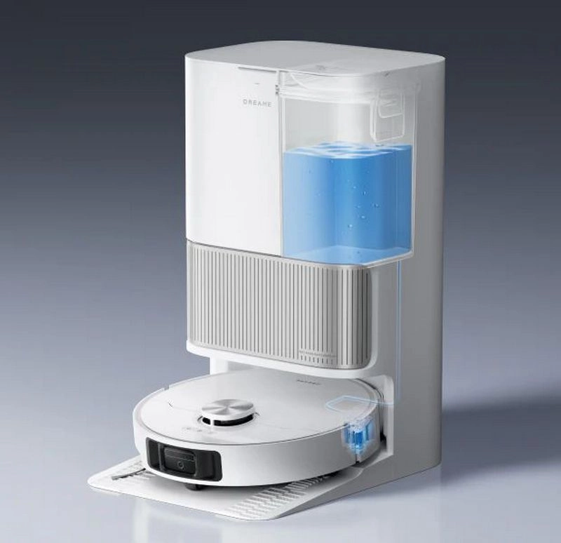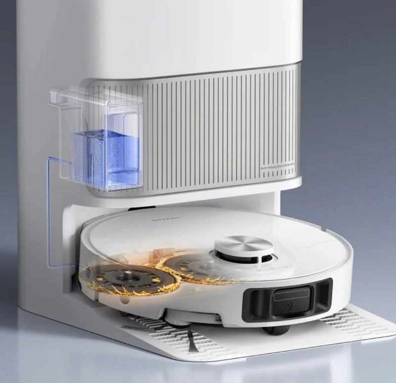 В Dreame L40S Ultra док-станция самостоятельно следит за уровнем воды в баке робота и при необходимости автоматически доливает её, чтобы насадки всегда оставались влажными. Это позволяет устройству проводить длительную влажную уборку без пауз и вашего участия, поддерживая чистоту на всех этапах работы.