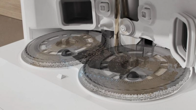 Полностью автоматизирует уход за тряпками и поддоном: горячая вода из 20 форсунок промывает насадки, быстро вращающиеся тряпки очищают саму стиральную доску, а грязная вода сразу удаляется в слив. Всё происходит без вашего участия — никакой грязи, запахов и необходимости вручную мыть детали после уборки.