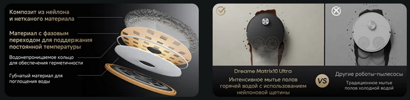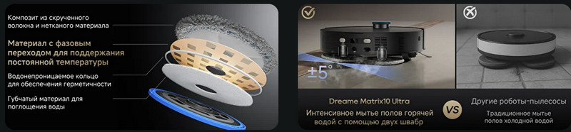 Технология Dreame Matrix 10 Ultra сочетает работу двух салфеток для швабры и горячей воды, что обеспечивает эффективное удаление стойкой грязи и жиров даже с неровных поверхностей. Термические салфетки не только улучшают уход за напольными покрытиями в гостиной, но и гарантируют гигиену благодаря мойке при температуре до 100 °C.