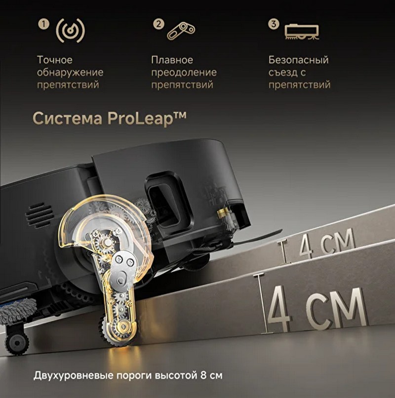 Система ProLeap в Dreame Matrix 10 Ultra точно обнаруживает и анализирует преграды, автоматически выбирает плавный способ их преодоления и безопасно спускается даже с порогов высотой до 8 см. Благодаря этому уборка всегда проходит без остановок — робот эффективно справится с любыми уровнями пола в вашем доме.