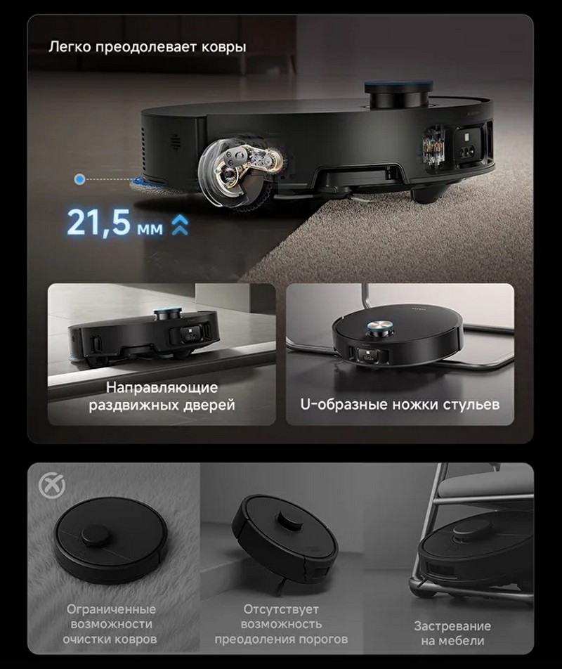 Благодаря трехколесному шасси AgiLift, Dreame Matrix 10 Ultra легко справляется с коврами высотой до 21,5 мм, направляющими дверей и U-образными ножками мебели. Такая конструкция минимизирует вероятность застревания, обеспечивая максимально плавную уборку без остановок и ограничения доступа.