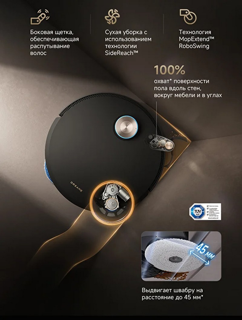 Раздвижная система MopExtend RoboSwing позволяет выдвигать швабру для уборки под мебелью и в углах, а специальная боковая щеточка SideReach обеспечивает эффективное подметание вдоль стен и в труднодоступных местах. Такой подход гарантирует 100% охват пола по всей поверхности — даже в самых сложных для уборки зонах.