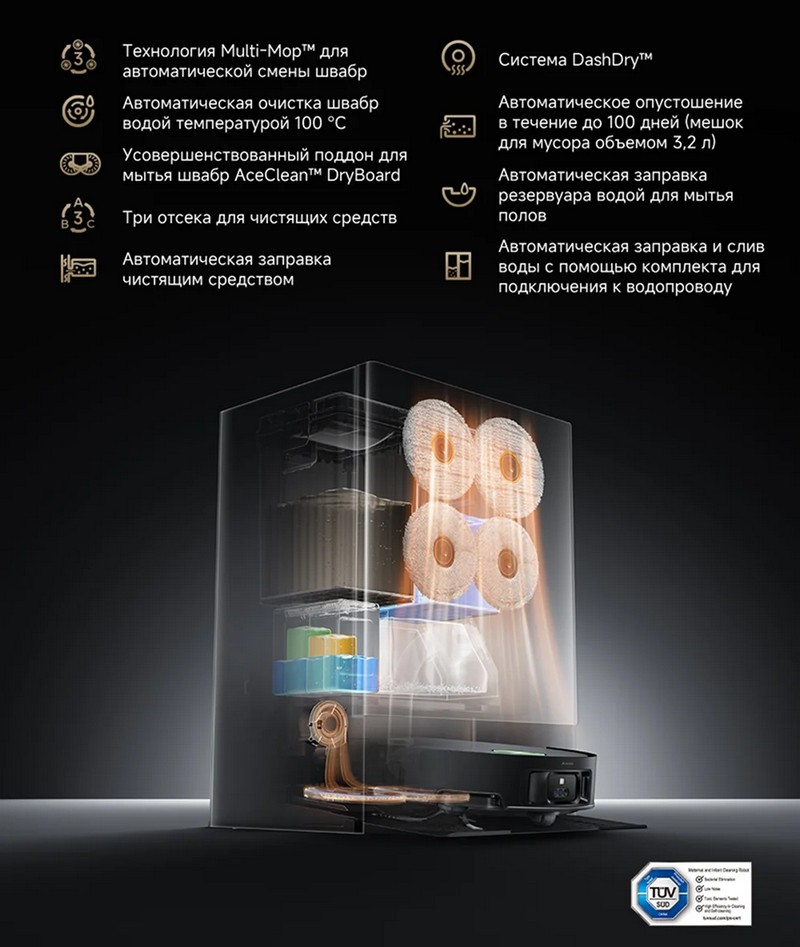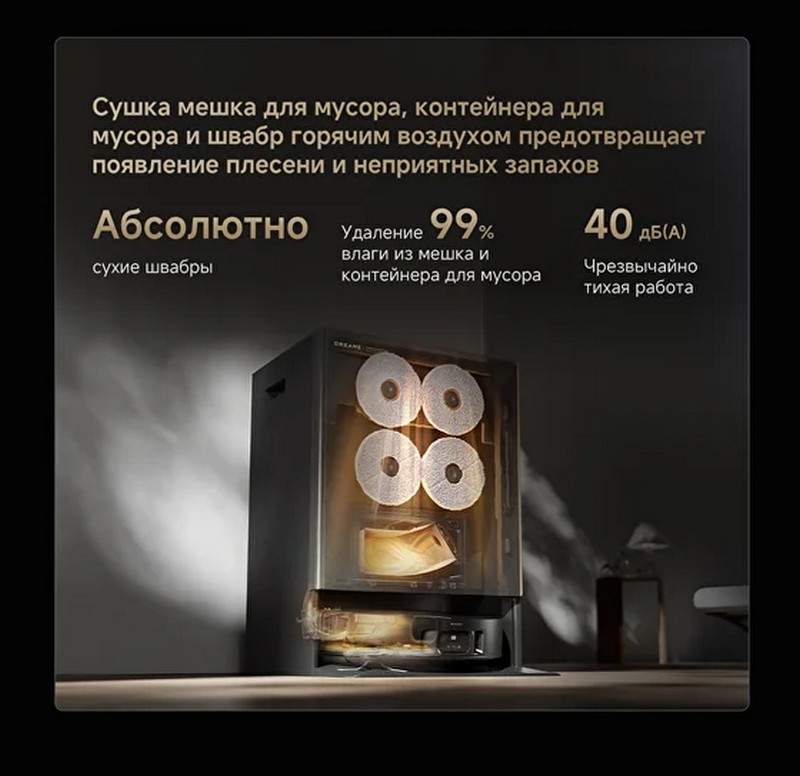 В Dreame Matrix10 Ultra реализована система автоматической промывки швабр с нагревом воды до 100 °C, а также технология DashDry для их быстрой сушки горячим воздухом, что исключает появление бактерий и неприятного запаха. Инновационный поддон AceClean DryBoard дополнительно подогревает воду и обеспечивает безупречную гигиену без необходимости ручного ухода за станцией.