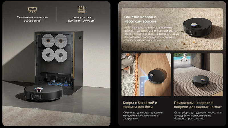 Matrix10 Ultra самостоятельно убирает ковры с длинным ворсом, автоматически снимая швабры для максимальной сухости, и увеличивает мощность всасывания при двойном проходе. Для уборки ковров с коротким ворсом и придверных или йога-матов робот поднимает швабры, чтобы предотвратить намокание и обеспечить эффективный сбор грязи с поверхности.