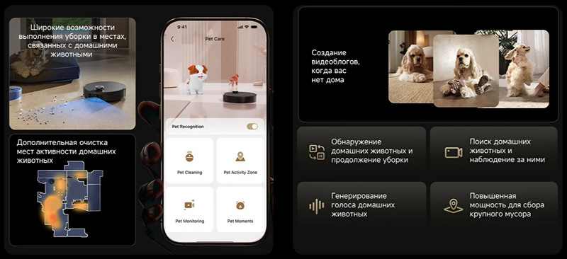 Matrix10 Ultra с помощью интеллектуальных алгоритмов бережно убирает в местах активности домашних животных, точно определяет зоны их пребывания, а также взаимодействует с ними через приложение Dreamehome. Поддержка видеонаблюдения, голосовых уведомлений и режимов усиленной уборки помогает поддерживать комфортную обстановку и идеально чистый дом, даже когда вы находитесь вне дома.