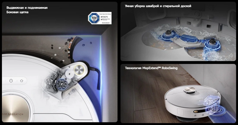 Выдвижная боковая щетка позволяет убирать в местах недоступных обычным пылесосам: пространство вокруг мебельных ножек, углы стен, крошки под корпусной мебелью и т.д.