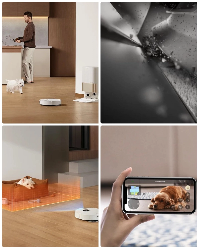 Позволяет настроить запретные зоны рядом с лежанками и мисками, выбрать оптимальный режим для уборки рассыпанного наполнителя, а встроенная камера позволяет наблюдать за питомцами в ваше отсутствие и даже передавать им голосовые приветствия.