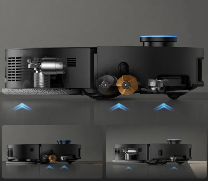 Благодаря тройной подъемной системе Dreame X50 Master синхронизирует работу боковой щётки, основной щётки и швабр, чётко разделяя сухую и влажную уборку. Это позволяет роботу плавно переходить между разными напольными покрытиями и эффективно обходить препятствия, обеспечивая безупречную чистоту и блеск на любых поверхностях.