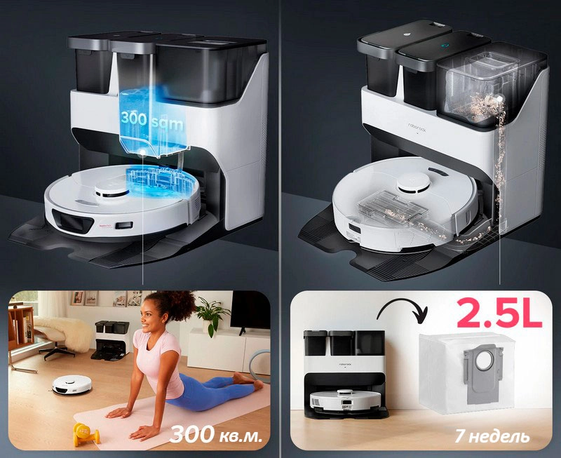 Док-станция Roborock S7 Max Ultra — это полная автоматизация процесса уборки. Она заправляет робот-пылесос водой, очищает пылесборник робота после уборки, стирает и сушит швабру пылесоса, очищает ролик робота-пылесоса. От вас требуется только менять воду в док-станции и раз в 1,5 месяца выбрасывать мешок с мусором.