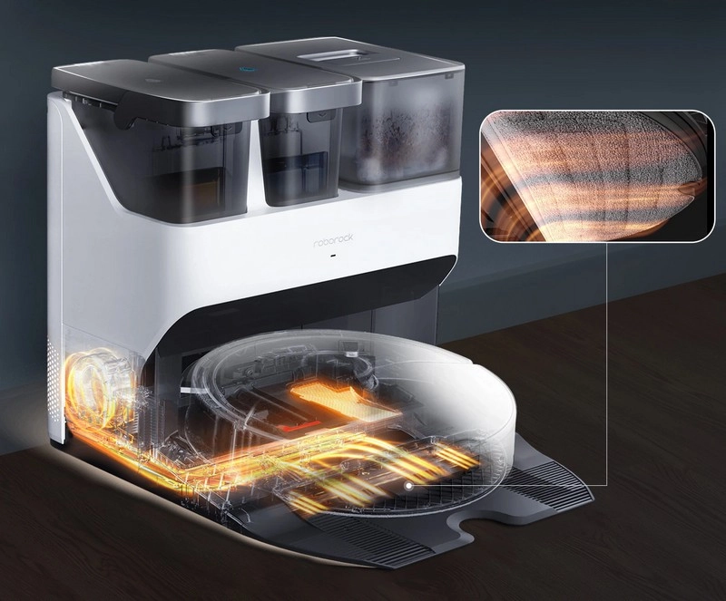Заключительный этап очистки — это сушка теплым воздухом швабры, робота и основания док-станции.