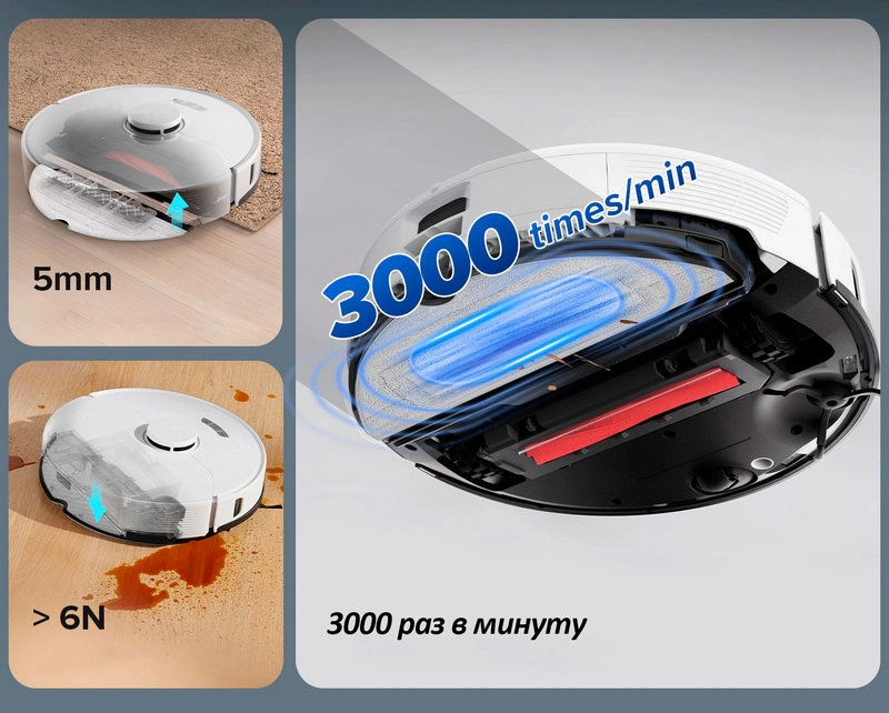 Пылесос оснащен модулем для мытья пола, который вибрирует 3000 раз в минуту и с давлением 6Н эффективно оттирает присохшие загрязнения и другие сложные пятна.