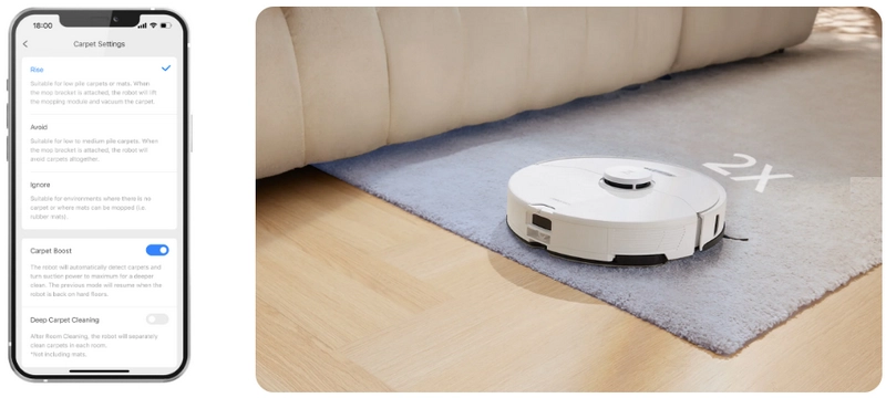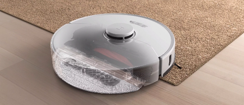 Roborock S7 Max Ultra оснащена ультразвуковым датчиком распознавания ковров. Благодаря этому пылесос автоматически поднимает швабру на 5 мм при заезде на ковер.