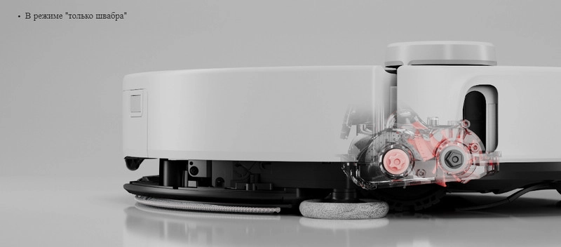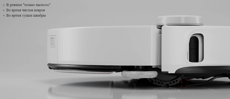Пылесос может одновременно пылесосить и мыть пол, только пылесосить, только мыть пол или же возвращаться на базовую станцию с поднятой шваброй и щеткой.