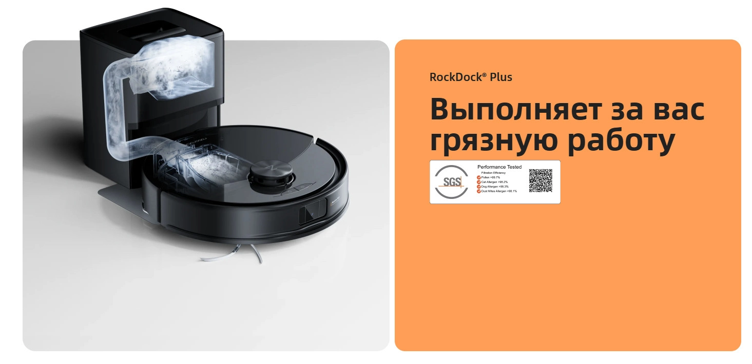 RockDock Plus освобождает вас от рутинной работы: большой мешок для пыли вмещает мусор на срок до 7 недель, а система эффективно снижает уровень аллергенов, делая уборку идеальным решением для семей с питомцами.