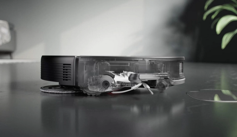 Четыре подъемных механизма (шасси, основная щетка, боковая щетка и швабры) работают согласованно, автоматически подстраиваясь под разные сценарии уборки: швабры поднимаются над коврами, основная щетка отрывается от пола при переходе между помещениями, а боковая щетка складывается у стены — такая гибкость позволяет одинаково эффективно чистить любые поверхности, от паркета до плитки, избегая намокания ковровых покрытий и обеспечивая бережную уборку без пропущенных участков.
