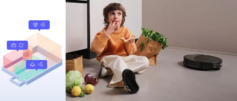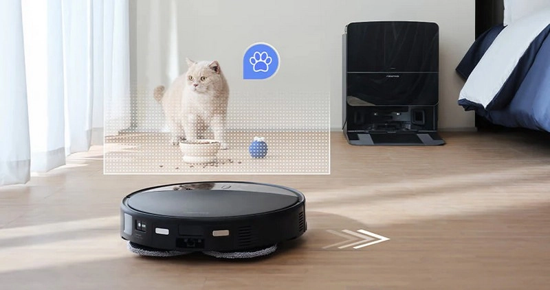 Умная система распознавания животных и зон их обитания делает уборку безопасной и комфортной для ваших питомцев. Робот заранее отключает основную щетку и аккуратно объезжает животных, чтобы не напугать их. При этом вокруг мисок и лежанок он автоматически усиливает мощность всасывания, тщательно убирая шерсть и рассыпанный корм.