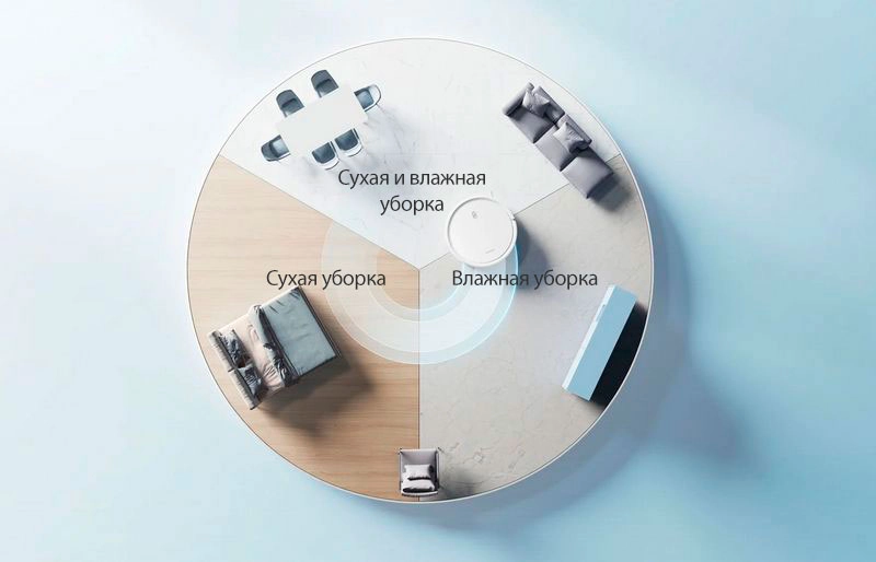 Робот-пылесос может работать в режиме сухой уборки, влажной или комбинированной, когда пылесос одновременно собирает мусор и протирает пол.