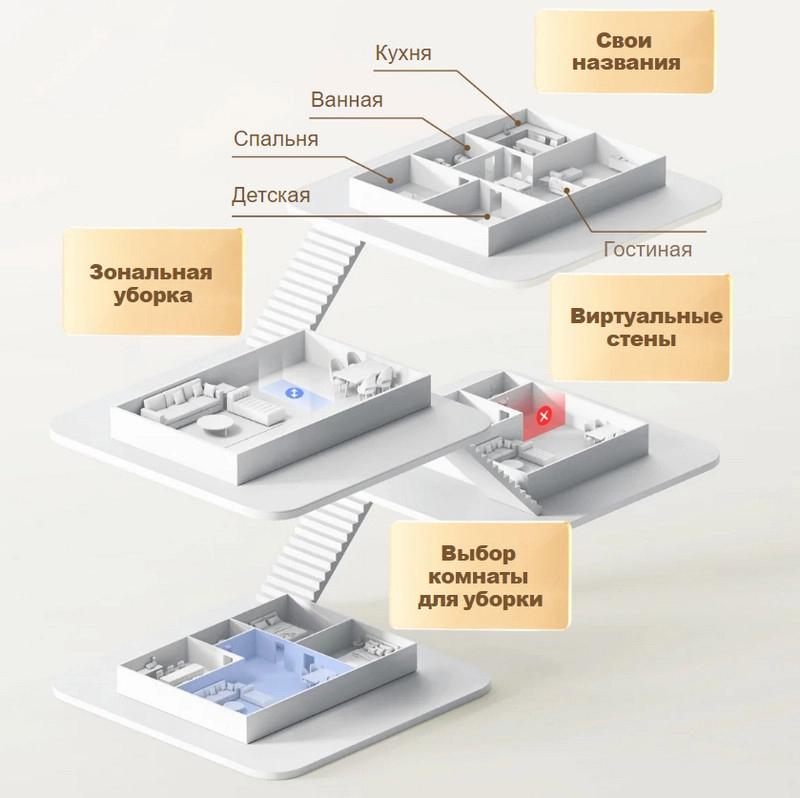 Настраивайте режимы уборки так, как удобно вам. Очищайте выбранные зоны, переименовывайте комнаты, создавайте виртуальные стены и запретные зоны.