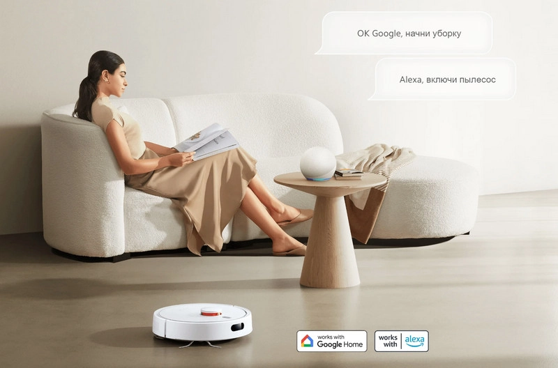 Пылесос поддерживает управление через голосовых ассистентов Google, Alexa и Алиса.