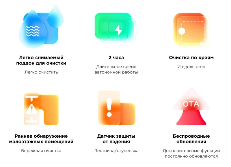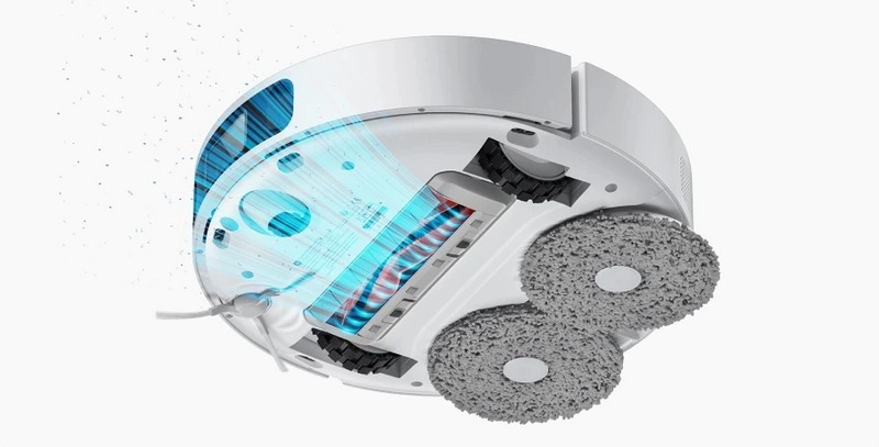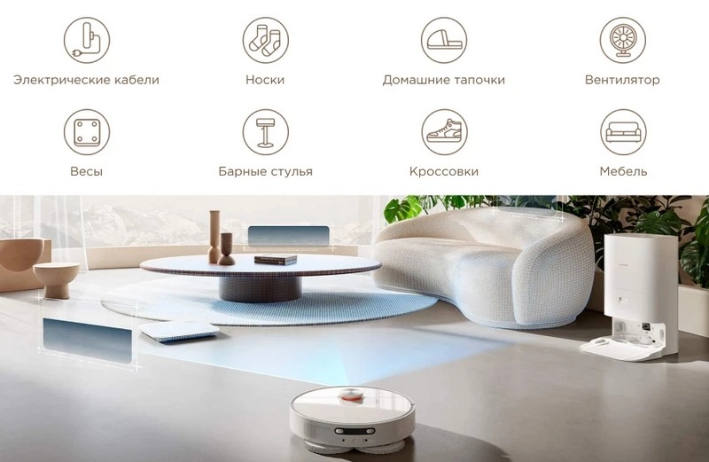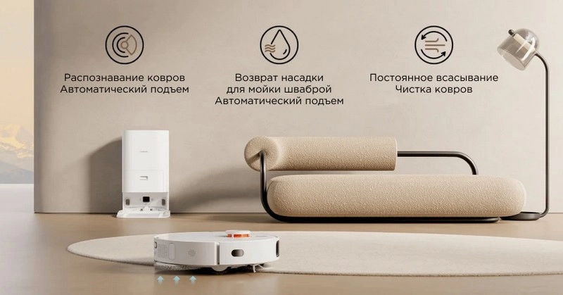 Ультразвуковой сканер Xiaomi X10 Plus распознает ковровые покрытия и при заезде на них автоматически увеличивает мощность всасывания, прижимая швабру. Диски для влажной уборки могут подниматься на 7 мм, если ковры толще 5 мм или имеют длинный ворс, то рекомендуется выбрать опцию «объезд ковров» в приложении.