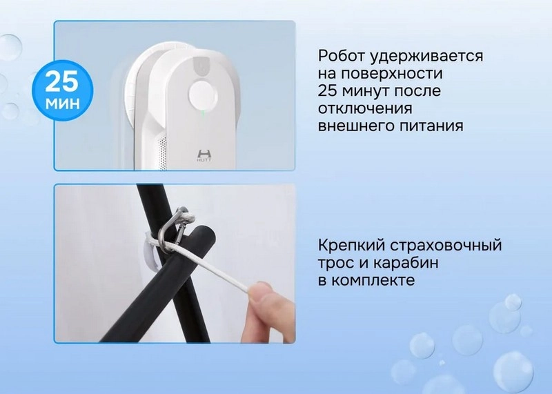Помимо кабеля питания, робот имеет страховочный трос длиной 4 метра и встроенный аккумулятор, который удерживает Hutt DDC56 на стекле в течение 25 минут, если отключилось электропитание.