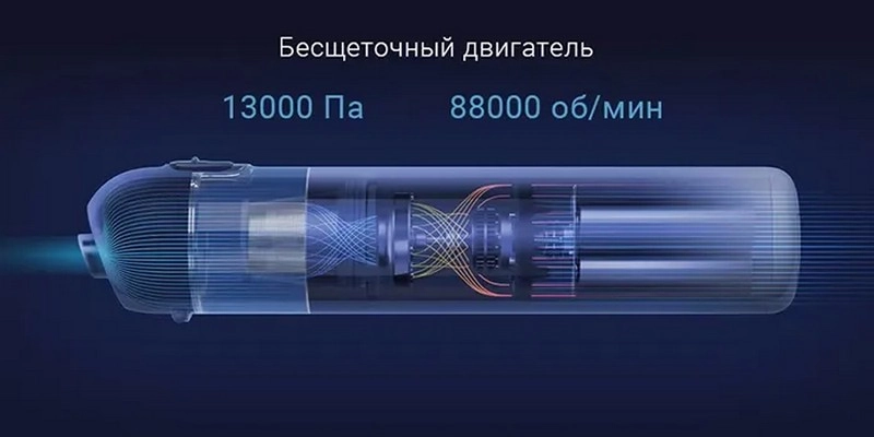 Внутри пылесоса установлен бесщеточной двигатель, который вращается со скоростью 88 000 оборотов в минуту и формирует воздушный поток с мощностью 13000 Па.