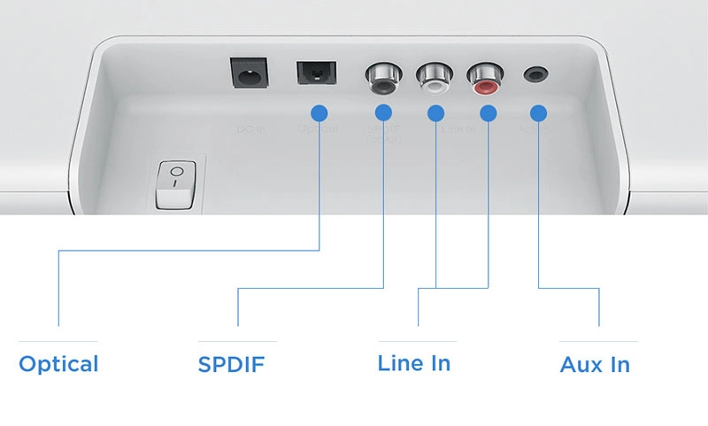 Xiaomi Mi TV Soundbar оснащен несколькими разъемами (Line, Aux, SPDIF, Optical), посредством которых можно подключить практически любое звукопроводящее оборудование.