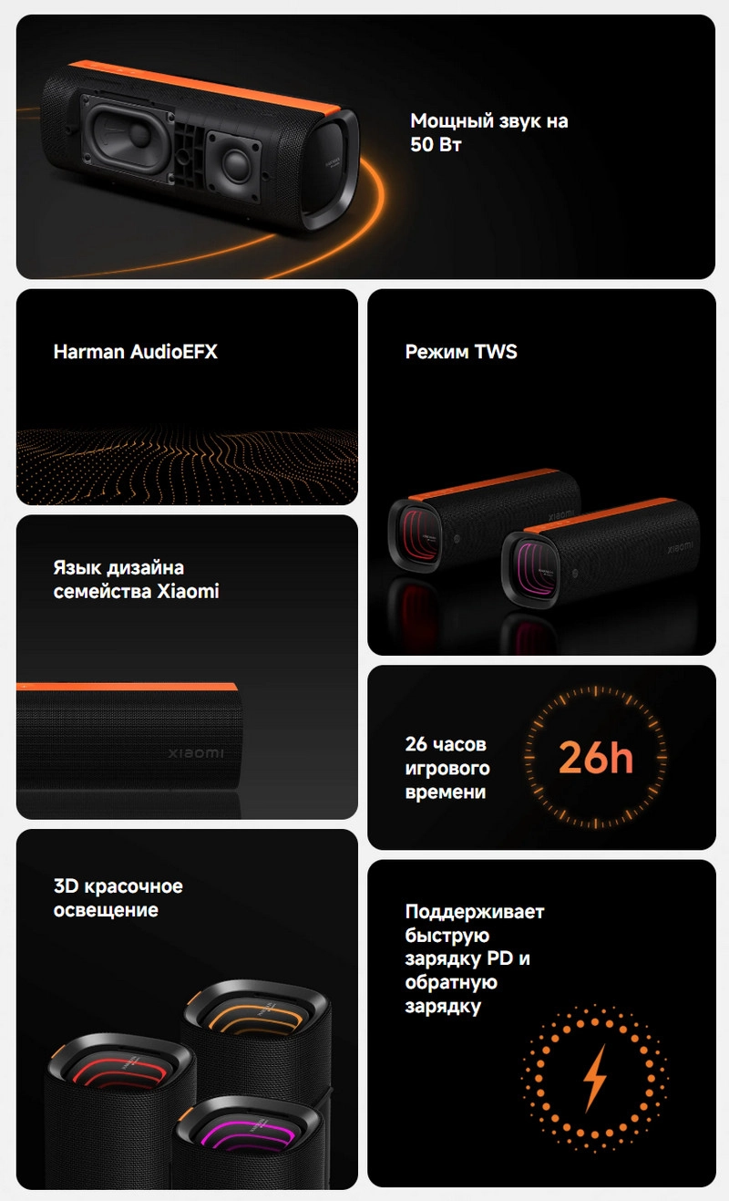 Саундбар Xiaomi Sound Party NS7-GL (QBH4321GL) выдает 50 Вт звучания, оптимизированного системой Harman AudioEFX. Комбинация 15-Вт твитера и 35-Вт сабвуфера с активацией Bass Boost формирует объёмную сцену с чистыми верхами и насыщенными низами. Корпус с интегрированной ручкой и фирменной 3D-подсветкой делает устройство стильным и удобным для переноски, а защита IP67 гарантирует устойчивость к влаге и пыли. Поддержка TWS и Party Connect открывает возможность объединить колонки в стереопару или настроить синхронное воспроизведение до сотни устройств. Автономность до 26 часов, быстрая PD-зарядка и функция реверсной подзарядки позволяют использовать колонку и как источник питания для других гаджетов.