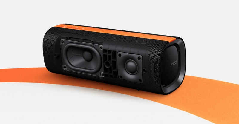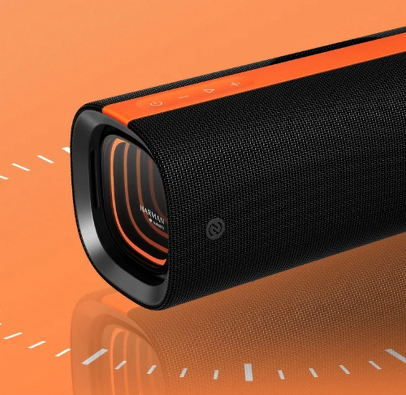Корпус выполнен в контрасте оранжевого и чёрного, что придаёт устройству динамичный и современный вид. Обтекаемая форма и плавные линии подчёркивают эстетику и делают колонку удобной для переноски.