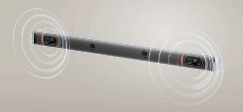 Мощные двухполосные динамики суммарной мощностью 30 Вт воспроизводят детализированный звук с насыщенными низкими и чёткими высокими частотами. Технология объёмного звучания создаёт эффект присутствия, превращая домашние киносеансы в захватывающее аудиовизуальное путешествие с кинематографическим качеством.