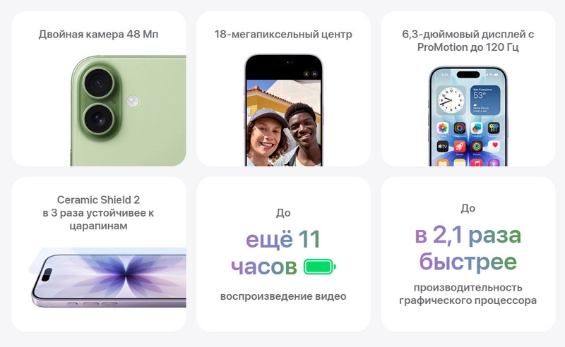 Базовая модель получила 48-МП камеру, 18-МП фронталку, экран 6,3″ с ProMotion 120 Гц, Ceramic Shield 2 и увеличенное время работы.