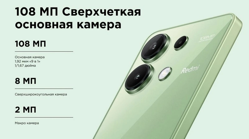 Создавайте потрясающие фотографии с новой мощной камерой Redmi Note 13. Тройная основная камера включает в себя главный сенсор с разрешением 108 Мп, сверхширокий объектив разрешением 8 Мп и марко-сенсор на 2 Мп.