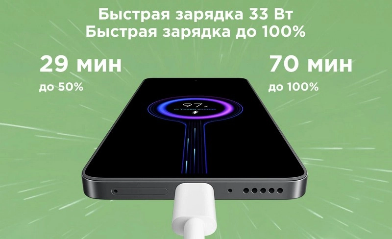 Смартфон поставляется с зарядным устройством мощностью 33 Вт. От 0% до 50% он заряжается за 29 минут, а до 100% за 70 минут.