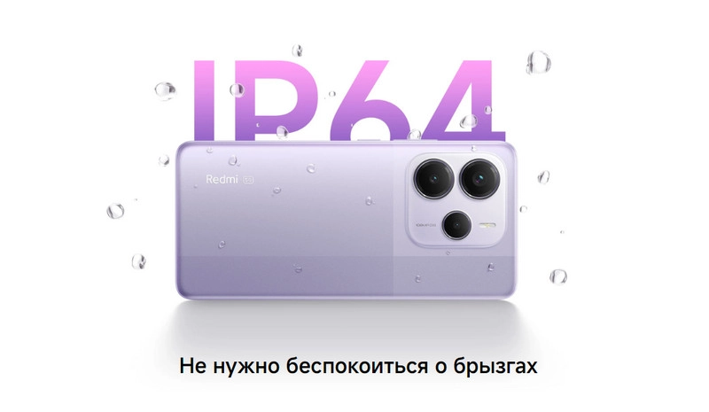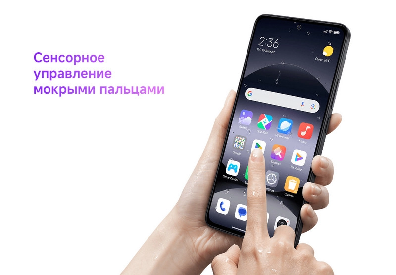 Сенсор Redmi Note 14 реагирует на касания мокрыми или жирными руками, внезапный дождь не помешает управлению смартфоном.
