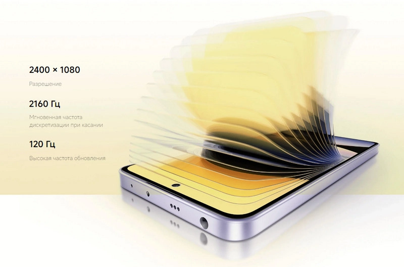 С диагональю 6,67" поддерживает разрешение 2400 х 1080, частоту обновления 120 Гц и пиковую яркостью 2100 нит. Благодаря частоте дискретизации при касании 2160 Гц смартфон моментально откликается на прикосновения.
