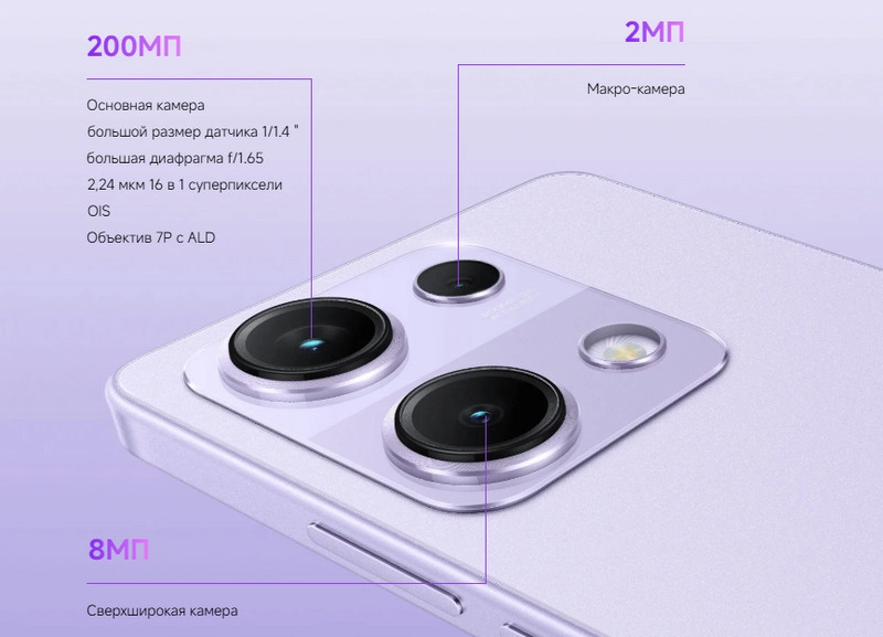Redmi Note 14S оснащён основной камерой на 200 Мп с оптической и электронной стабилизацией для чётких снимков даже в движении. Крупный сенсор 1/1.4", светосильная оптика f/1.65 и технология Super Pixels улучшают качество при слабом освещении. Ультраширокий объектив на 8 Мп и макрокамера на 2 Мп расширяют творческие возможности.