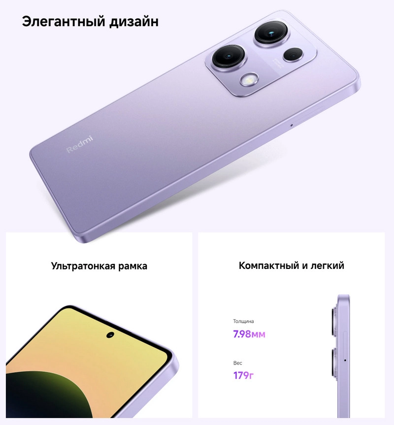 Redmi Note 14S представлен в стильных оттенках: фирменном Aurora Purple, строгом Midnight Black и освежающем Ocean Blue. Динамическая цветовая палитра подчёркивает дизайн и придаёт устройству яркую индивидуальность.