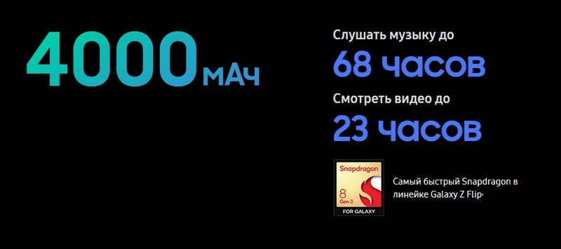 Galaxy Z Flip оснащен самым емким аккумулятором в своей линейке — 4000 мАч. В сочетании с процессором Snapdragon 8 Gen 3-го поколения для Galaxy, он обеспечивает длительную работу без подзарядки. Вы можете слушать музыку до 68 часов, смотреть видео до 23 часов или заниматься другими задачами весь день. Это идеальный баланс мощности и автономности для вашей активной жизни.