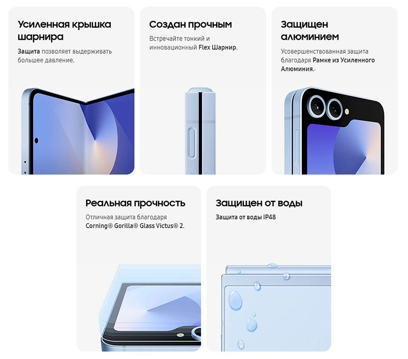 Впервые в Galaxy Z Flip используется испарительная камера, которая эффективно охлаждает устройство, предотвращая перегрев. Эта технология быстро рассеивает тепло, обеспечивая стабильную работу даже при интенсивных нагрузках. Теперь ваш смартфон остается мощным и надежным в любых условиях.
