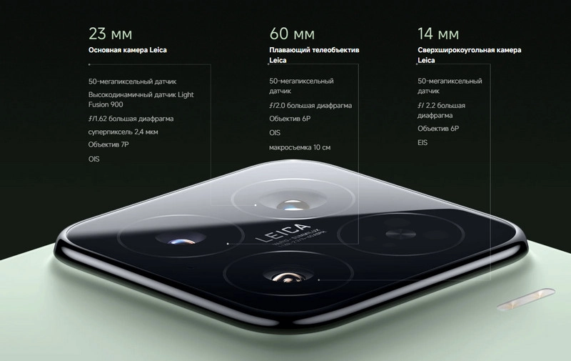 | Основная камера | 50 Мп + 50 Мп + 50 Мп. Основная камера Leica 50 Мп (датчик изображения Light Fusion 900, суперпиксель 4-в-1 размером 2,4 мкм, f/1,6, оптическая стабилизация изображения (OIS), фокусное расстояние эквивалентно 23 мм). Плавающий телеобъектив Leica 60 мм 50 Мп (f/2.0, OIS, фокусное расстояние эквивалентно 60 мм). Сверхширокоугольная камера Leica 50 Мп (f/2.2, эквивалентное фокусное расстояние 14 мм, угол обзора 115°) | |