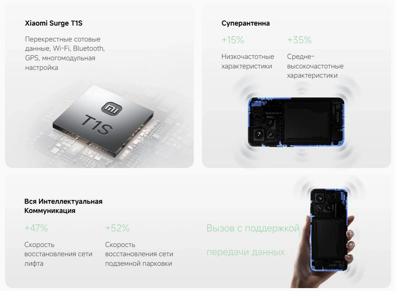 Xiaomi 15 оснащен чипом Xiaomi Surge T1S Tuner, улучшенной системой антенн и поддержкой интеллектуальной связи на базе ИИ, что значительно улучшает качество связи. С увеличением производительности на низких и средне-высоких частотах, скорость восстановления сети в лифтах и подземных парковках повышена на 47% и 52%. Поддержка звонков с использованием мобильных данных улучшает качество связи и делает её более стабильной.