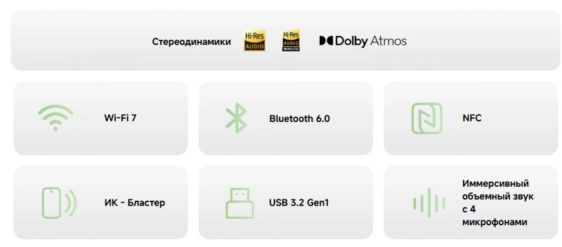 | Характеристики звука | Стереодинамики, 4-микрофонная система. Сертификация Hi-Res и Hi-Res Audio Wireless, Dolby Atmos. | |