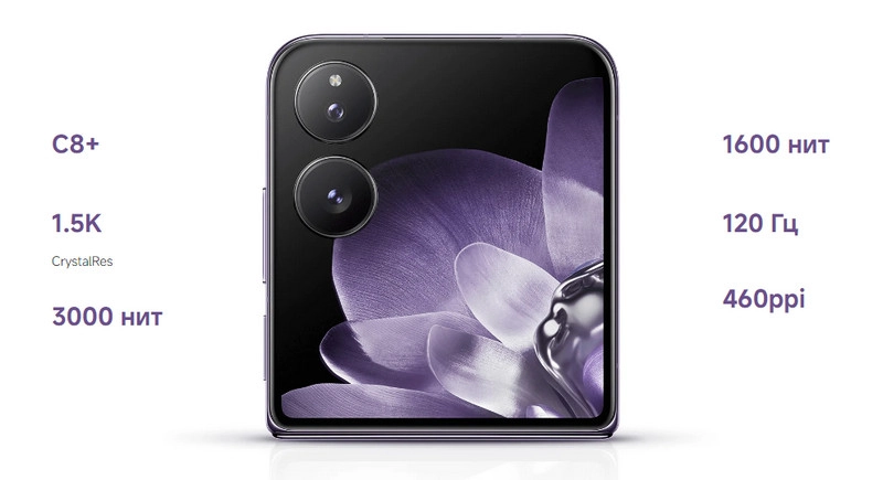 По своим характеристикам внешний AMOLED-дисплей Xiaomi Mix Flip не уступает основному. Он имеет диагональ 4,01" с разрешением 1,5K и яркостью 3000 нит. Экран поддерживает частоту обновления до 120 Гц и имеет высокую плотность пикселей 460 ppi.