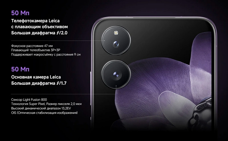 50-мегапиксельная камера с оптическим объективом Leica Summilux получила большую диафрагму и отличные оптические характеристики. Камера смартфона оснащена датчиком изображения Light Fusion 800, диафрагмой f/1.7 и оптической стабилизацией.