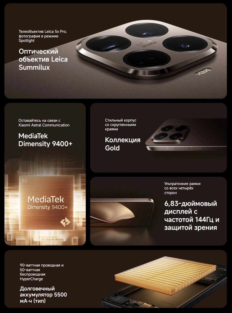 Флагманская камера Leica с оптическим зумом 5x, дисплей 144 Гц, чип Dimensity 9400+, зарядка 90/50 Вт и защита IP68 делают устройство мощным, стильным и профессиональным инструментом для фото, видео и повседневных задач.